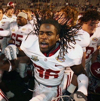 Eric Gray jumps for joy after he and his Alabama teammates defeated Colorado in the PetroSun Independence Bowl 30-24, Sunday, Dec. 30, 2007 in Shreveport, LA.