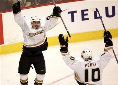 Anaheim Ducks' Francois Beauchemin, left, celebrates his goal with teammate Corey Perry during the second period of NHL playoff action in Vancouver, Canada, Sunday April 29, 2007 (AP Photo/Chuck Stoody,CP) |