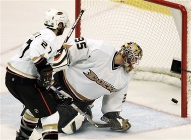 Anaheim Ducks goalie Jean-Sebastien Giguere (35) and defenseman Scott Niedermayer (27) watch the puck go into the net on a shot from Vancouver Canucks Brendan Morrison during the second period of Game 4 of the Western Conference semifinal hockey game Tuesday, May 1, 2007 in Vancouver, British Columbia. (AP Photo/Chuck Stoody, CP) |
