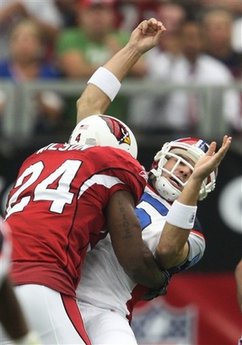 Second-year quarterback Trent Edwards, a major reason Buffalo was one of three unbeaten teams entering the day, went down with a concussion on a fierce hit from Cardinals safety Adrian Wilson on the third play of the game. It was the Bills' defense that collapsed after that.