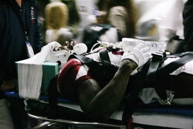 Arizona Cardinals' Anquan Boldin is wheeled to a waiting ambulance after being injured late in the fourth quarter of an NFL football game against the New York Jets on Sunday, Sept. 28, 2008, in East Rutherford, N.J.