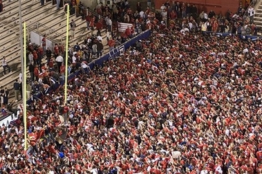 Arizona fans storm the field and the goal post after Arizona defeated Oregon 34-24 in a college football game at Arizona Stadium in Tucson, Ariz., Thursday, Nov. 15, 2007. (AP Photo/Wily Low) |
