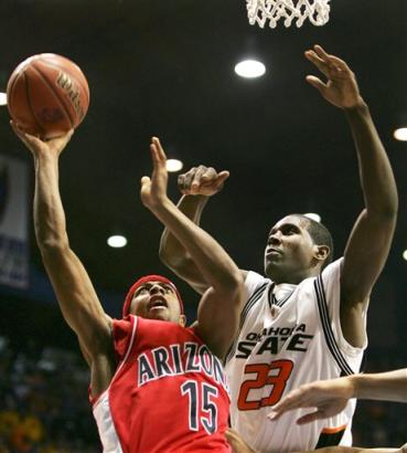 Arizona's Mustafa Shakur drives to the basket past Oklahoma State's Ivan McFarlin in the second half of their Chicago Regional semifinal game in the NCAA tournament Thursday, March 24, 2005, at the Allstate Arena in Rosemont, Ill. (AP Photo/Jeff Roberson) |