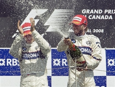 BMW Formula One driver Robert Kubica, left, of Poland, and teammate Nick Heidfeld, of Germany, celebrate after finishing in first and second at the Canadian Grand Prix at the Circuit Gilles Villeneuve Sunday, June 8, 2008 in Montreal.