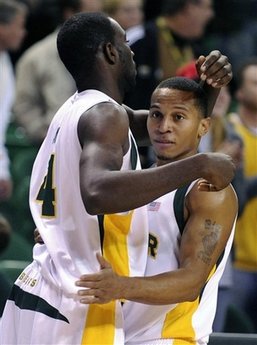 Baylor guard Curtis Jerrells, right, gets a hug from teammate Quincy Acy, left, after posting a triple-double with 17 points, 11 rebounds, and 10 assists during an NCAA men's college basketball game Monday, Dec. 22, 2008 in Waco, Texas. Baylor defeated Hartford 74-59.