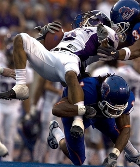 Weber States Bryant Eteuata (6) gets tackled by Boise States Kyle Wilson (1) (bottom) and Michael Lose (30) during the college football game on Thursday, August 30, 2007, at BSU in Boise, Idaho. At the half BSU lead 49-0. (AP Photo/Matt Cilley) |