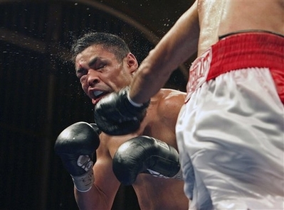 Oscar Diaz, left, takes a punch from Delvin Rodriguez during their USBA welterweight title fight at Municipal Auditorium in San Antonio, Texas Wednesday July 16, 2008. Diaz spent the night in surgery after collapsing between rounds of the nationally televised bout in his hometown.