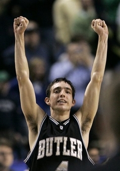 Butler's A.J. Graves celebrates after defeating Maryland, 62-59, in a second round NCAA Midwest Regional tournament basketball game Saturday, March 17, 2007, in Buffalo, N.Y. (AP Photo/David Duprey) |