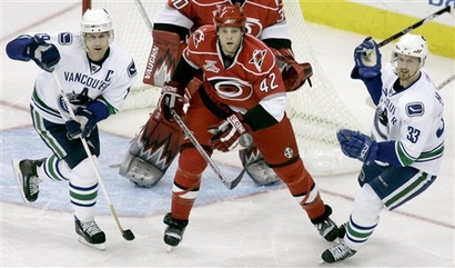 Carolina Hurricanes' Tim Gleason (42) and Vancouver Canucks' Markus Naslund, left, of Sweden, and Henrik Sedin (33), of Sweden, keep an eye on the puck during the third period of an NHL hockey game in Raleigh, N.C., Monday, Oct. 22, 2007. Carolina won 3-1.