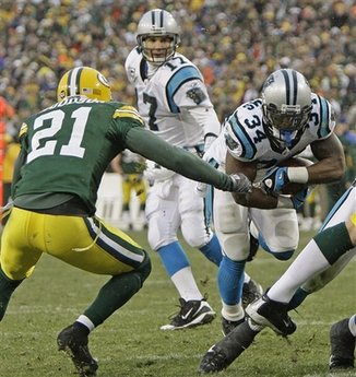 Carolina Panthers running back DeAngelo Williams (34) gets past Green Bay Packers cornerback Charles Woodson (21) for the game-winning touchdown during the second half of an NFL football game Sunday, Nov. 30, 2008, in Green Bay, Wis. The Panthers won 35-31.