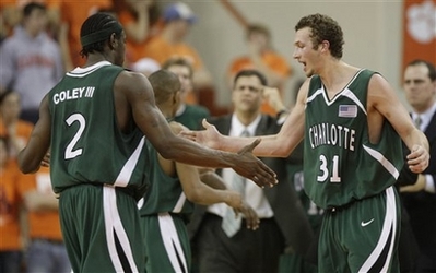 Charlotte's Charlie Coley, left, and teammate Charles Dewhurst react after extending their lead against Clemson during the second half of their basketball game in Clemson, S.C., Wednesday, Jan. 9, 2008. Charlotte won, 82-72.