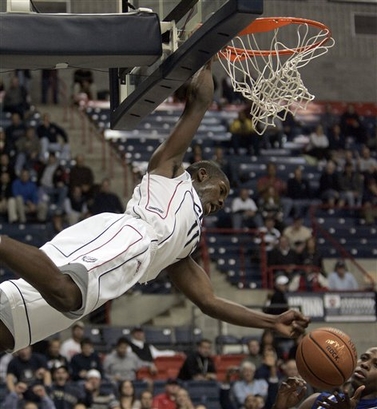 Connecticut's Jerome Dyson hangs on the rim after a dunk in the second half of a basketball game against Buffalo in the College Hoops Classic in Storrs, Conn., Thursday, Nov. 8, 2007. Dyson was called for a technical foul. Connecticut won 82-57.