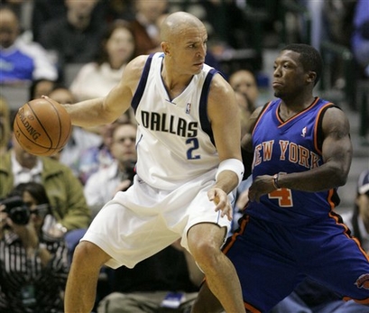 New York Knicks guard Nate Robinson (4) defends as Dallas Mavericks gaurd Jason Kidd (2) works the ball inside during the first half of an NBA basketball game in Dallas, Thursday, Jan. 8, 2009. The Mavericks won 99-94. (AP) |