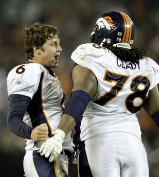 Denver Broncos quarterback Jay Cutler (6) celebrates with offensive tackle Ryan Clady after Cutler's 11-yard touchdown pass to Brandon Marshall late in the Broncos' 34-30 win over the Cleveland Browns in an NFL football game Thursday, Nov. 6, 2008, in Cleveland.