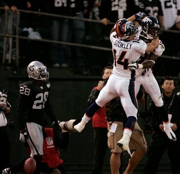 Denver Broncos wide receiver Eddie Royal, right, celebrates with teammate Brandon Stokley (14) after Royal's touchdown reception next to Oakland Raiders safety Gibril Wilson (28) during the first half of an NFL football game in Oakland, Calif., Monday, Sept. 8, 2008.