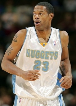Denver Nuggets forward Marcus Camby heads down the court during an NBA basketball game in Denver in this photograph taken on Friday, Nov. 4, 2005. Camby was named the NBA's Defensive Player of the Year on Friday, April 27, 2007, after leading the league in blocked shots for the third time. (AP Photo/David Zalubowski) |