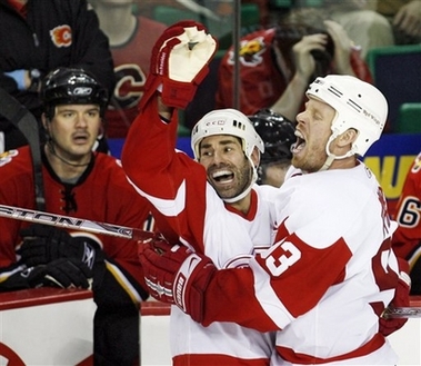 Notes:@ Detroit was scoreless on five power-play chances, while Calgary went 0-for-4. ... Flames defenseman Mark Giordano took a puck in the face off a shot by Mathieu Schneider in the first period, but later returned. ... Flames defenseman Robyn Regehr (knee) skated Sunday morning, but was scratched for the fourth straight game. ... Defenseman Brent Lebda wasn't in Detroit's lineup. His leg was twisted awkwardly into the boards while checking Daymond Langkow on Saturday. Kyle Quincey replaced him. ... After losing two games at the Saddledome last week, the Red Wings switched up their stall assignments in the visitors' dressing room Sunday.