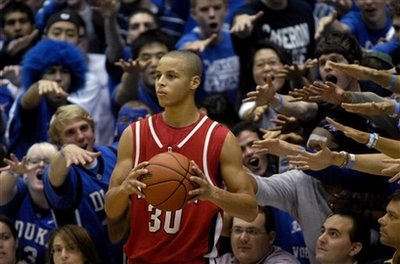 Davidson's Stephen Curry (30) is taunted by Duke fans, known as the 'Cameron Crazies,' during the first half of an NCAA college basketball game against Duke at Cameron Indoor Stadium in Durham, N.C., Wednesday, Jan. 7, 2009.