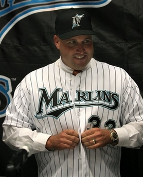 Fredi Gonzalez puts on his jersey and smiles after being named the new Florida Marlins manager at a press conference Tuesday, Oct. 3, 2006 in Miami. (AP Photo/Luis M. Alvarez) |