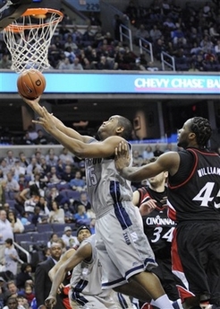 Georgetown's Austin Freeman (15) goes to the basket against Cincinnati's John Williamson (45) during the second half of a college basketball game, Saturday, Feb. 23, 2008, in Washington. Freeman scored 13 points as Georgetown won 73-53.