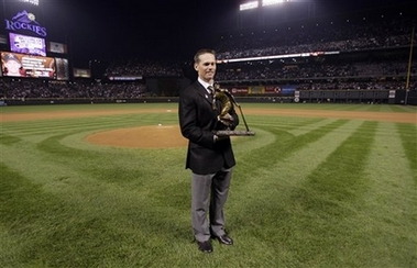 Roberto Clemente Man of the Year Award recipient Houston Astros' Craig Biggio holds up his award before Game 3 of the baseball World Series Saturday, Oct. 27, 2007, at Coors Field in Denver. (AP Photo/David J. Phillip) |