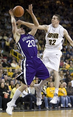 Northwestern's Craig Moore (20) is fouled by Iowa's Jake Kelly (32) while driving to the basket during the first half of an NCAA college basketball game, Saturday, Feb. 7, 2009, in Iowa City, Iowa. (AP) |