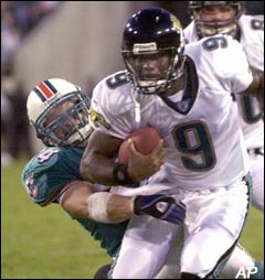 Jacksonville Jaguars quarterback David Garrard, right, is sacked by Miami Dolphins defensive tackle Dario Romero. (AP Photo/Phil Coale) |