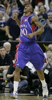 Kansas made sure the rowdy fans didn't stay in their seats long, hitting eight of its first 10 shots, including all four 3-point attempts. Chalmers led the way, going 5-of-6 from 3-point range and finishing the first half with 17 points. Rush hit four 3-pointers for 12 points.