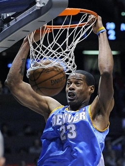 In this March 21, 2008 file photo, Denver Nuggets center Marcus Camby dunks the ball during the fourth quarter of NBA basketball against the New Jersey Nets in East Rutherford, N.J. The Los Angeles Clippers acquired Camby from the Nuggets Tuesday, July 15, 2008 in exchange for a future second-round draft pick.