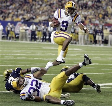 LSU quarterback Jordan Jefferson (9) leaps over Georgia Tech's Mario Butler (2), Michael Ray and LSU's Charles Scott (32) during the first quarter of the Chick-fil-A Bowl NCAA college football game on Wednesday, Dec. 31, 2008 in Atlanta.