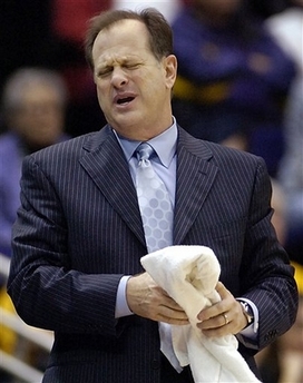 LSU head coach John Brady winces after a referee's call on one of his players late in the second half of their college basketball game with Arkansas in Baton Rouge, La., in this Jan. 26, 2008 file photo. Brady was fired as LSU's basketball coach Friday Feb. 8, 2008.