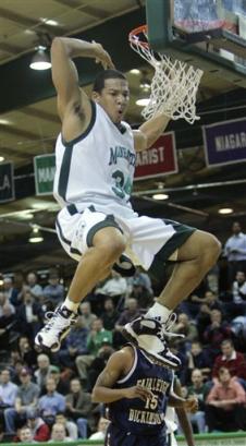 Manhattan College's Arturo Dubois follows through on a dunk in the first half of basketball action against Farleigh Dickinson Tuesday March 14, 2006 in New York. (AP Photo/Frank Franklin II) |