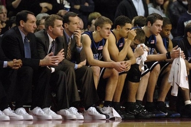 The Duke bench watches the final seconds of their basketball game against Maryland Sunday, Feb. 11, 2007 in College Park, Md. Maryland won 72-60. (AP Photo/Gail Burton) |