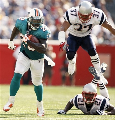 Miami Dolphins running back Ronnie Brown runs for a 62-yard touchdown past New England Patriots' Deltha O'Neal (21) and Rodney Harrison during the fourth quarter of the Dolphins' 38-13 win in an NFL football game at Gillette Stadium in Foxborough, Mass., Sunday, Sept. 21, 2008. Brown ran for 113 yards and four touchdowns and threw for another touchdown.(AP) |