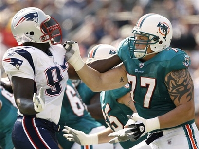 Miami Dolphins offensive tackle Jake Long (77) blocks New England Patriots defensive end Jarvis Green during their 38-13 win in a football game in Foxborough, Mass., Sunday, Sept. 21, 2008.(AP) |