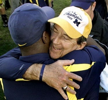 Michigan head coach Lloyd Carr, right, gets a hug from defensive coordinator Ron English following their win over Florida 41-35 in the Capital One Bowl football game in Orlando, Fla., Tuesday, Jan. 1, 2008.