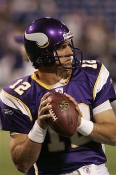 In this Aug. 8, 2008 file photo, Minnesota Vikings quarterback Gus Frerotte throws during warm-ups before their pre-season football game against the Seattle Seahawks in Minneapolis. The Minnesota Vikings are benching quarterback Tarvaris Jackson in favor of Gus Frerotte. Coach Brad Childress said Wednesday Sept. 17, 2008 that Frerotte will start Sunday against the Carolina Panthers.