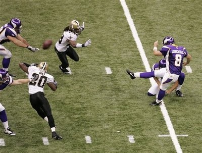 Minnesota Vikings' Ryan Longwell (8) kicks a field goal with 13 seconds left against the New Orleans Saints in an NFL football game in New Orleans, Monday, Oct. 6, 2008. The Vikings won 30-27.
