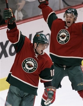 Minnesota Wild's Marian Gaborik, left, and Pavol Demitra, right, both from Slovakia, celebrate the go-ahead goal by Gaborik in third period of first round NHL Western Conference quarterfinal hockey game Tuesday, April 17, 2007 in St. Paul, Minn. The Wilid won 4-1. The Ducks lead the series 3-1. (AP Photo/Jim Mone) |