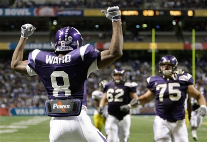 Northwestern's Rasheed Ward (8) celebrates with teammates Keegan Kennedy (62) and Al Netter (75) after he scored on a pass reception against Missouri during the third quarter of the Alamo Bowl NCAA college football game in San Antonio, Monday, Dec. 29, 2008. (AP) |