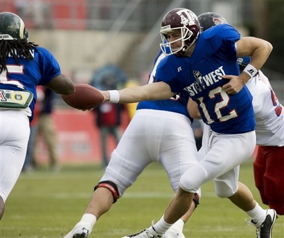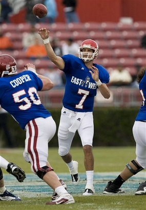West's Tom Brandstater (7) throws in the first half of the annual East-West Shrine college football all-star game on Saturday, Jan. 17, 2009, in Houston. (AP) |