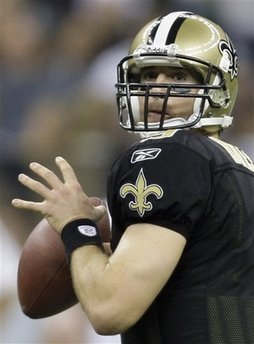 New Orleans Saints quarterback Drew Brees looks downfield against the Green Bay Packers in the second half of an NFL football game in New Orleans, Monday, Nov. 24, 2008.