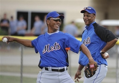 In this photo provided by the New York Mets, Darryl Strawberry, right, watches on as New York Mets left fielder Moises Alou warms before up a spring training baseball game, in Port St. Lucie, Fla. Monday, March 3, 2008. The Mets announced today that Strawberry, a former Met All-Star outfielder, will return to the club this season in a variety of capacities, starting as a special instructor this week during spring training.