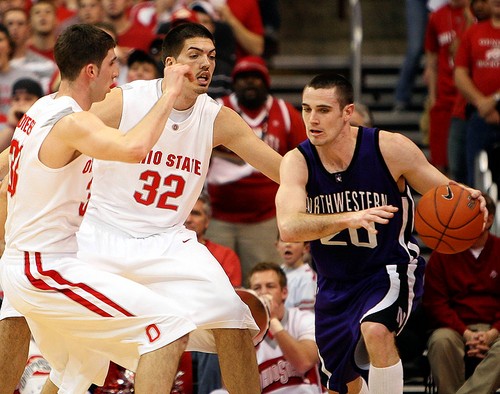 Northwestern's Craig Moore is pressured by Ohio State's B.J. Mullens and Jon Diebler. (Terry Gilliam, Associated Press / March 8, 2009) |