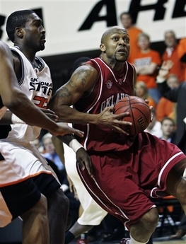 Oklahoma forward Nate Carter, right, moves around Oklahoma State's David Monds, left, on his way to the basket in the first half of an NCAA men's college basketball game in Stillwater, Okla., Monday, Jan. 22, 2007. (AP Photo/Sue Ogrocki) |