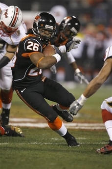 Oregon State running back Yvenson Bernard carries the ball for a first down against Maryland during the first quarter of the Emerald Bowl college football game in San Francisco, Friday, Dec. 28, 2007.