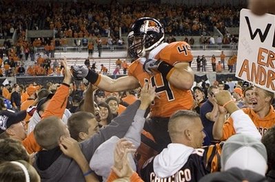 Oregon State defender Greg Laybourn is carried through the crowd after they beat No. 1 ranked Southern California 27-21 in their NCAA college football game in Corvallis, Ore., Thursday, Sept. 25, 2008. Laybourn made an interception at the end of the game.