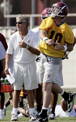 Southern California, Los Angeles' football coach Pete Carroll watches as quarterback John David Booty throws the ball during practice Thursday, Aug. 3, 2006, in Los Angeles. (AP Photo/Nick Ut) |