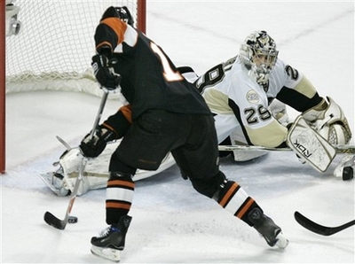 Philadelphia Flyers forward Jeff Carter, left, lines up his shot, which he scored past Pittsburgh Penguins goalie Marc-Andre Fleury (29), for the third goal of the first period in Game 4 of the NHL Eastern Conference hockey finals in Philadelphia, Thursday, May 15, 2008.