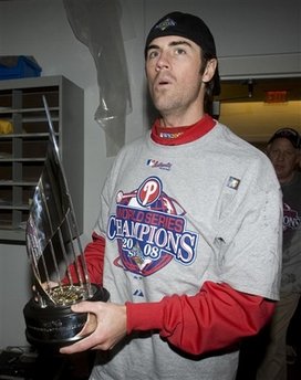 Philadelphia Phillies' Cole Hamels holds his MVP trophy after Game 5 of the baseball World Series in Philadelphia, Wednesday, Oct. 29, 2008. The Phillies defeated the Tampa Bay Rays 4-3 to win the series.